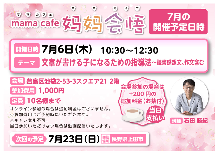 7月6日(木) 10:30〜12:30 7月のテーマ 文章が書ける子になるための指導法……