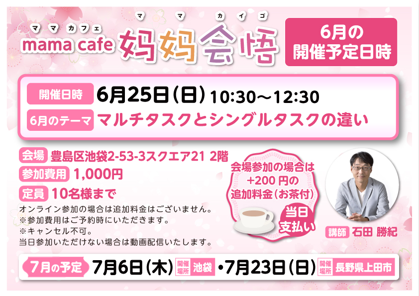 6月25日(日) 10:30〜12:30 6月のテーマ マルチタスクとシングルタスクの……
