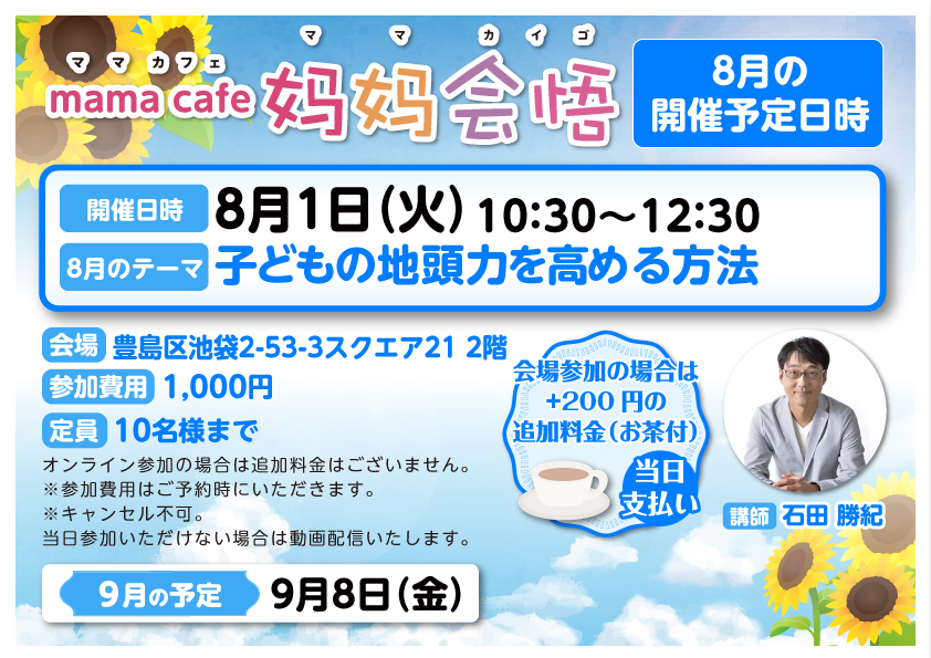 8月1日(火) 10:30〜12:30 8月のテーマ 子どもの地頭力を高める方法 ……